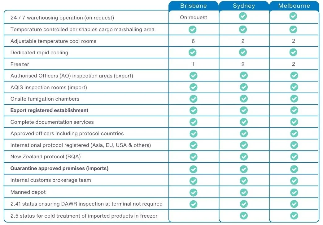 Our specialised air-freight service provides onsite quarantine inspection offices, year-round fumigation and treatment facilities, temperature and quality checks and cold-treatment rooms operating at –18°C. We keep your products compliant, protected and market-ready.