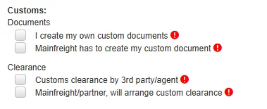 Mainfreight was made aware that it was found unclear which mandatory customs accessorials must selected. A more clear visual will has been added: if a required accessorial in a customs group is not selected, a red exclamation mark will be shown. Once the accessorial is selected, the red exclamation mark disappears.