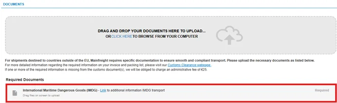 The document upload section, same as in place for custom countries, will now also be activated once you book a shipment that goes overseas and contains ADR (dangerous goods). This has been created to be made more aware of the documents that are required to transport ADR goods overseas and what the risks are if they are not uploaded/send to Mainfreight on time.
