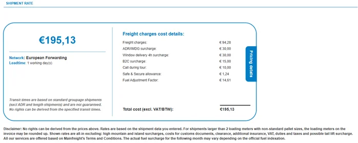 With this new feature, you are able to see the cost breakdown of your shipments. This section displays each charge line returned by pricing, providing clearer, itemized pricing transparency for your shipments. The cost include cost like freight charges, surcharges, fuel, pickup and delivery instruction. These cost can be seen when booking a shipment and can also be found back in your upload shipment overview.