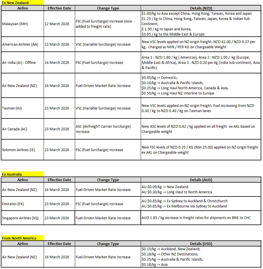 We have received multiple airline notifications advising of immediate fuel surcharge and pricing increases, effective from mid‑March. At the same time, capacity is tightening as airlines cancel or consolidate flights, placing further pressure on space availability and rates.