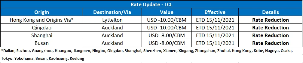 Based on these FCL container reductions Mainfreight will also apply an LCL reduction on all applicable lanes. This is summarised below with effective dates outlined.