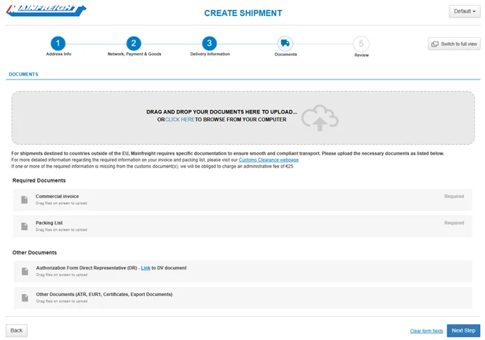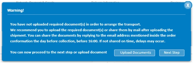 If you forget to upload one of the required documents, you will get a warning popup notifying you that you have forgot to upload one or more of the required documents needed for this shipment. You will then get 2 options to choose from. Either upload the documents during the booking process, or send the documents after the booking by mail before a certain time period.
