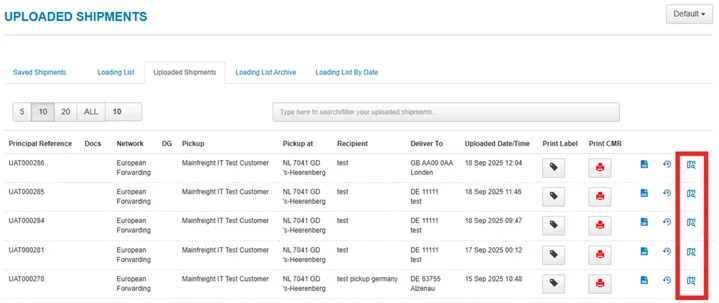 You will now have to option to link back to the Mainchain tracking page by selecting the new Track&Trace hyperlink button which has been added to the booking portal. The new option can be found at the Shipment Overview -> Uploaded Shipments. Pressing this new link will open the detailed tracking page of that specific shipment within Mainchain.