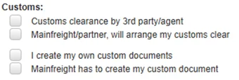 In the third step of the booking process, you now have to choose 2 of the 4 mandatory accessorials related to customs if you book a shipment to a customs related country. This to make sure Mainfreight gets the correct information on time regarding the customs clearance. These new mandatory accessorials are: