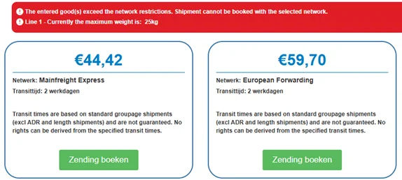 In the price calculation module, you will now receive a warning before booking a shipment if the pallet size or weight does not meet the network requirements.