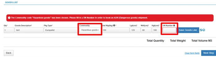 3. Mandatory to fill in a UN number when choosing the commodity Hazardous goods